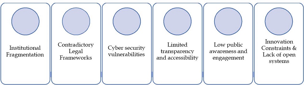 Pakistan’s digital landscape is evolving; however, despite the recent improvements, the system faces institutional fragmentation, legal contradictions, and operational inefficiencies. Government data is siloed across federal, provincial, and local levels due to the absence of standardized protocols, common platforms, and interoperable systems. Legal contradictions have also undermined transparency and accountability. Cybersecurity remains challenging, with poor oversight of sensitive data, fragmented regulatory authority, and weak enforcement, especially in the private sector. At the same time, public institutions rely on outdated data formats and inconsistent classification practices, further limiting digital service delivery and integration. Meanwhile, opacity around major decisions—such as the national firewall—continues to erode citizen trust and disrupt digital innovation. Further, the public awareness of digital rights remains low, and legal frameworks are often developed without inclusive consultation or local adaptation. The absence of open systems, PPP models, and standardized data protocols hampers innovation, interoperability, and the delivery of citizen-centric digital services. The figure below below further summarizes these challenges that need immediate attention.